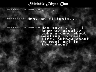 One day, after Virgil's mother berates him for his choice in future, Mistress Eternity offers up the plan to meet up in real life. Why so sudden? Will they be able to get along as much as they do in Shiniablo? Thus begins the meeting of offline friends, a meeting that will turn out darker than Virgil expects...